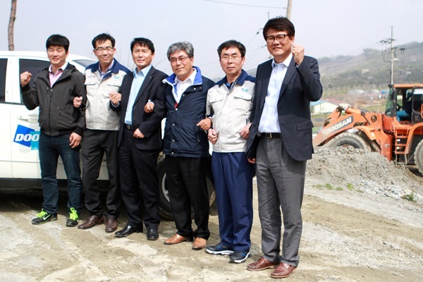 ▲ 走访全国参与客户服务活动的斗山工程机械申胜宇工会委员长(右起第二位)与相关人士共同下定决心提高产品质量。