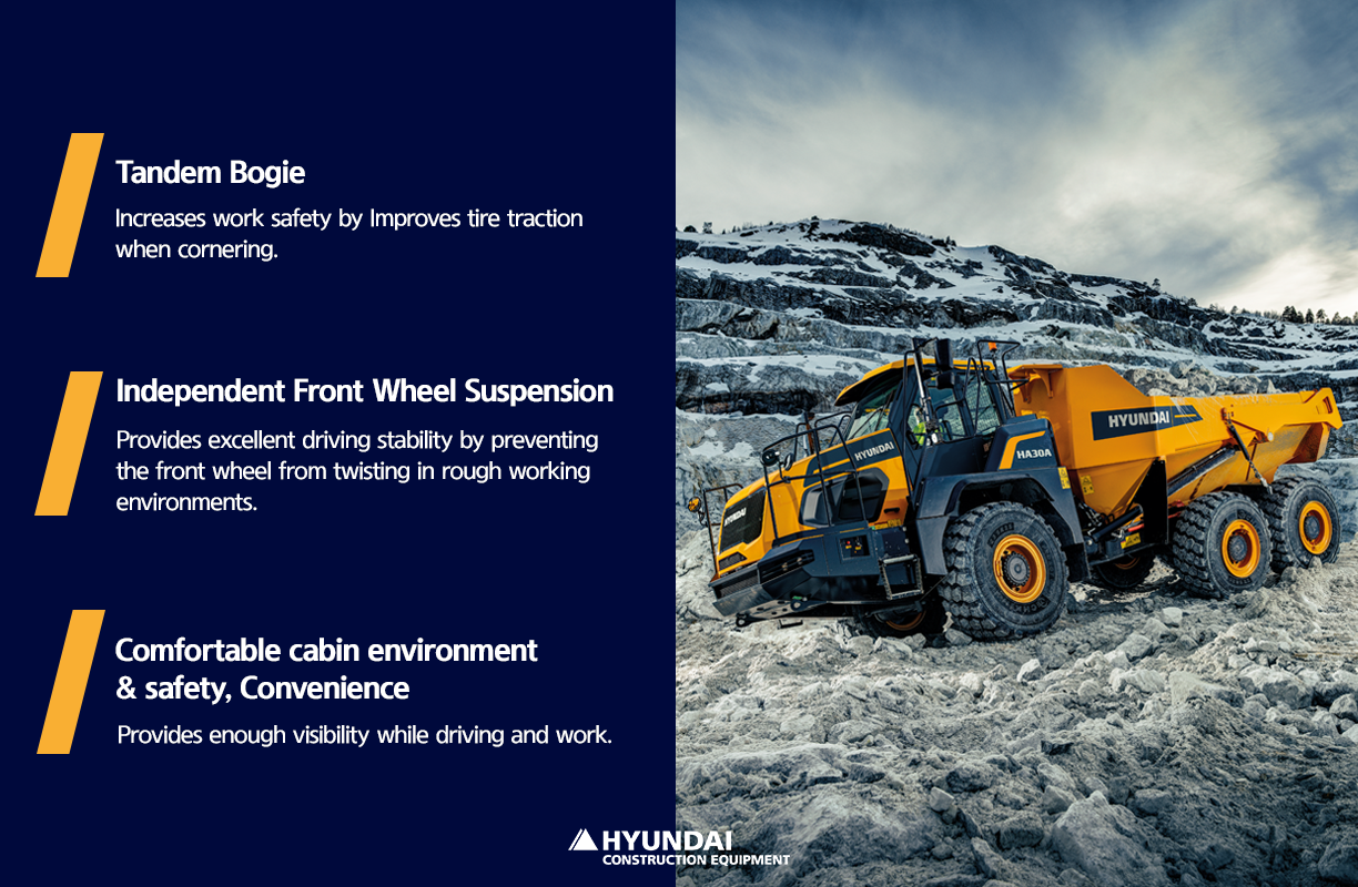 The excellent driving performance that is powerful enough to march through unpaved or bumpy surfaces is another advantage that Hyundai Construction Equipment’s ADT holds. To make the ADTs drive like no other, we applied a unique driving system developed by our company. While our competitors adopt three axles each turning two wheels, HCE’s ADT is applied with the Tandem Bogie design, in which one rear axle rotates four wheels. The motor system on the front, which resembles that of an SUV, is equipped with an independent suspension that directly connects the transmission and the wheels without a driving axle. Such a system allows driving the equipment to be incredibly comfortable in rugged, unpaved places where it is used the most, such as a quarry or a mine.
