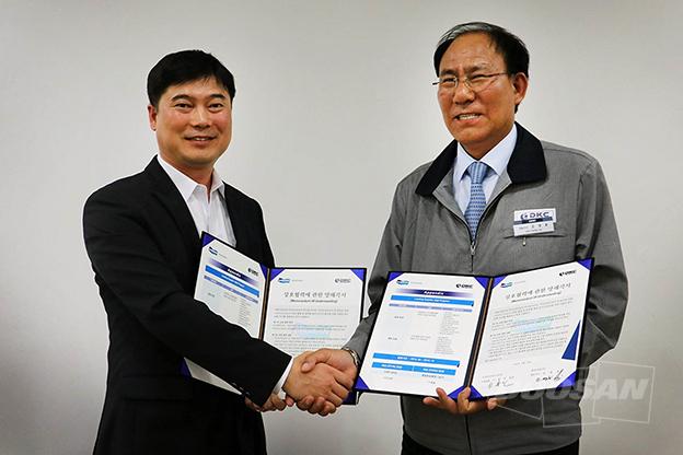 ▲ 두산인프라코어가 협력사 육성 프로그램 ‘2019 리딩 서플라이어’를 시작했다. 두산인프라코어 구매총괄 이용진 상무(사진 왼쪽)와 대경기업 조영호 대표이사가 프로그램 양해각서를 체결한 후 기념사진을 촬영하고 있다.