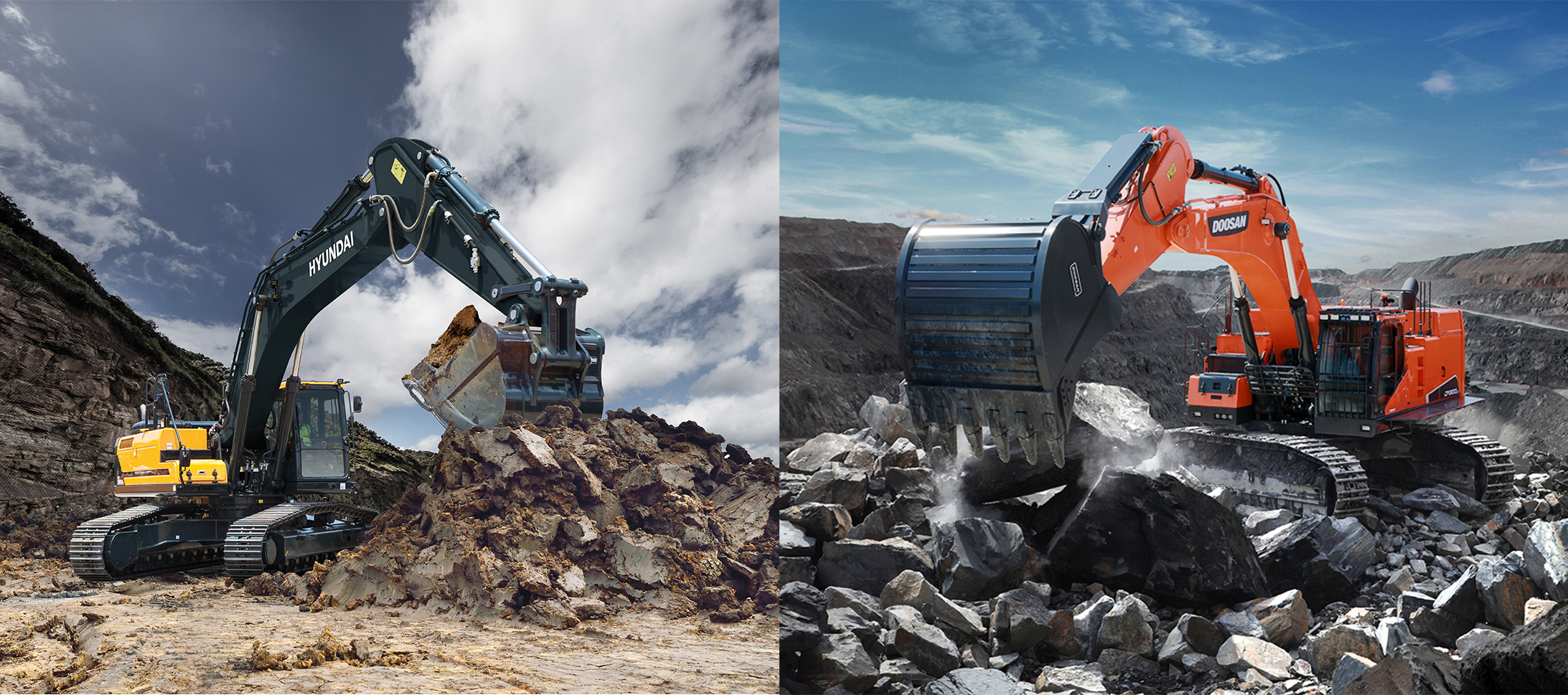 현대건설기계 제품인 38톤 크롤러 굴착기(사진 왼쪽), 현대두산인프라코어 제품인 80톤 크롤러 굴착기.