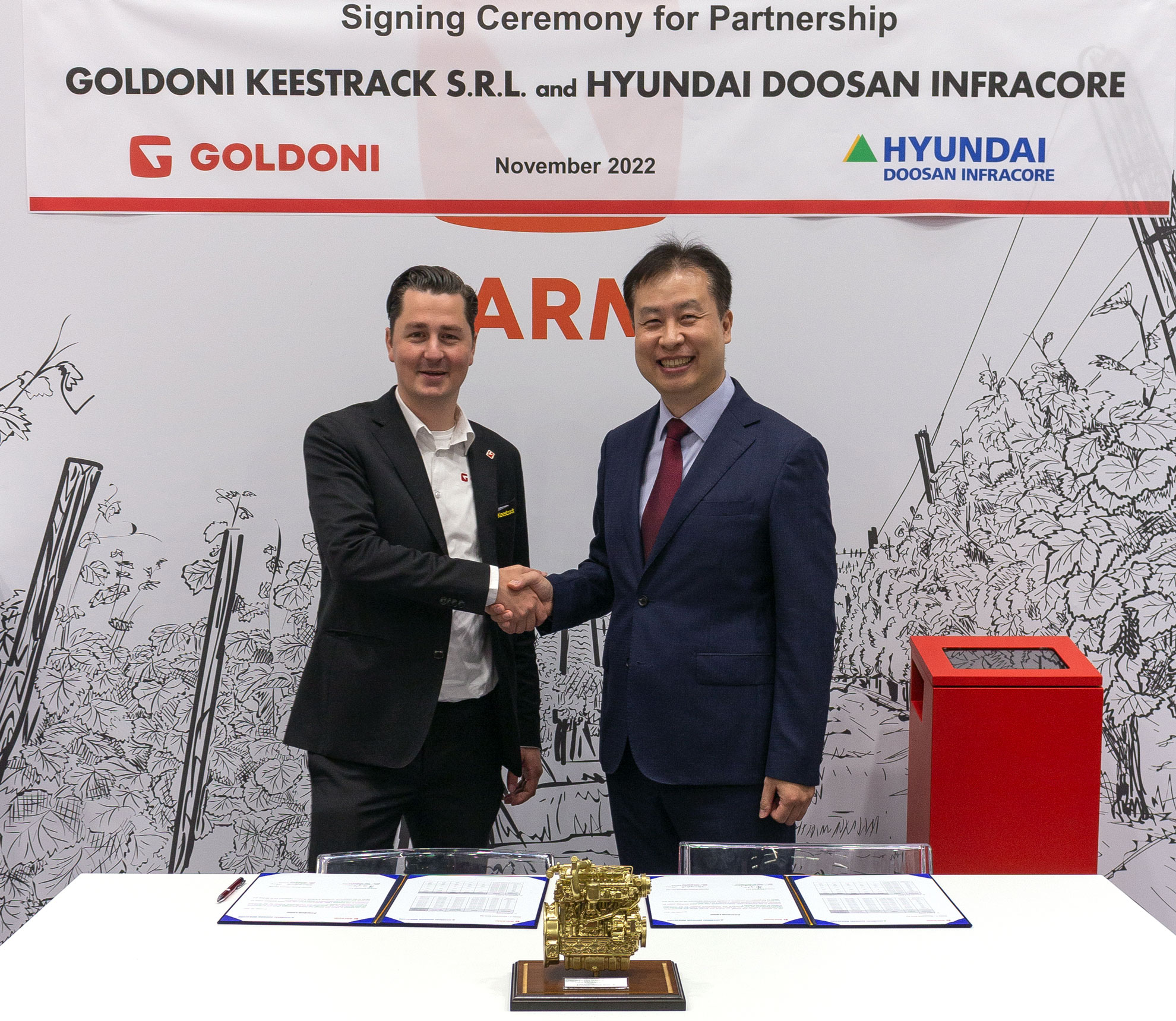 현대두산인프라코어는 이달 9일부터~13일까지 5일간 이탈리아 볼로냐에서 개최된 유럽 3대 농기계 전시회인 ‘2022 에이마’(EIMA international 2022)에 참가, 이탈리아 골도니 키스트랙(Goldoni Keestrack, 이하 ‘골도니’)사와 8,000대 규모의 엔진공급합의서에 서명했다고 밝혔다.