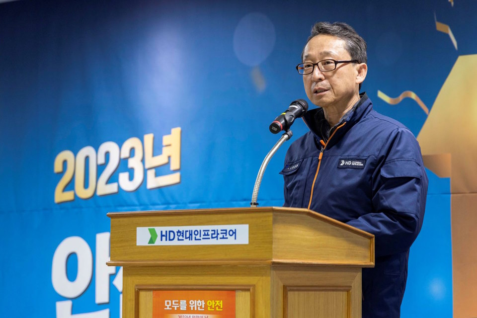 HD현대인프라코어 조영철 사장이 11일(화) 인천 동구 본사 대강당서 개최된 제10회 ‘안전의 날’ 행사에서 안전한 업장 구축에 대해 연설하고 있다.