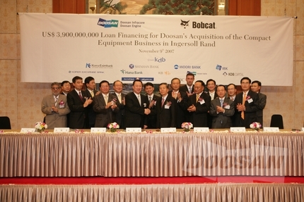 한편, 두산인프라코어는 지난 7월 30일 미국의 잉거솔랜드사와 밥캣 등 3개 사업부문에 대한 인수계약을 49억 달러에 체결한 바 있으며 지난 11월초에는 국내외 12개 금융기관과 인수금융을 체결함으로써 인수자금조달을 마무리한 바 있다. [끝]